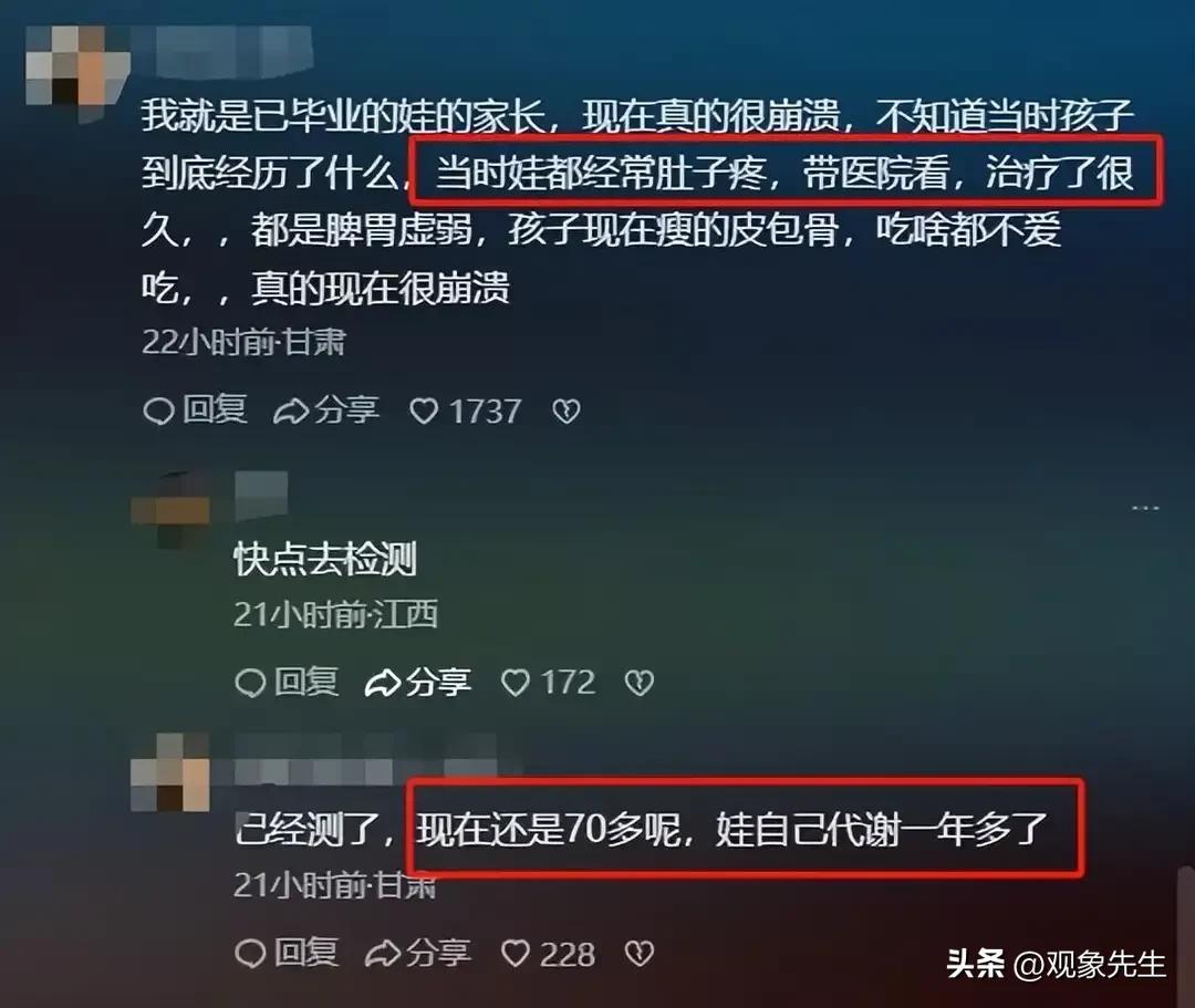 其实早在去年的时候,就有幼儿出现了身体异常的情况,除了牙发黑、有白头发之后,还有幼儿出现肚子疼,腿疼的情况。