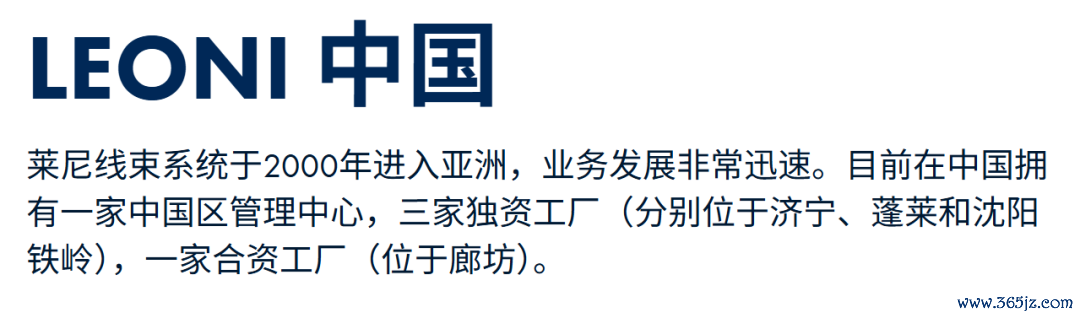 据莱尼中国官网介绍,作为汽车行业能源和数据管理产品、解决方案和服务的全球供应商,莱尼的综合销售额约为5亿欧元,在23个国家拥有约85000名员工。公司价值链涵盖电线、光纤、标准化电缆和特种电缆,以及定制开发的布线系统和相关组件和服务。