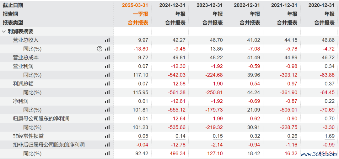 拉长时间轴,自2021年起,渤海汽车已经连续4年亏损。2021年—2024年,归母净利润亏损金额分别为0.9亿元、0.62亿元、1.99亿元、12.64亿元。2025年一季度归母净利润为55.68万元,同比扭亏为盈,但营业收入仍同比减少13.8%,扣非后归母净利润仍然处于亏损400多万元的状态。
