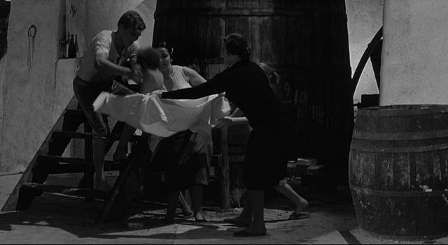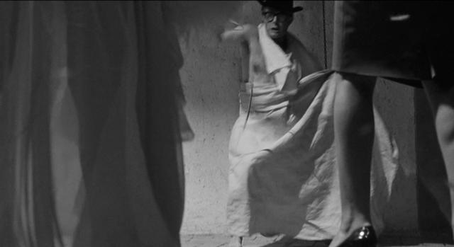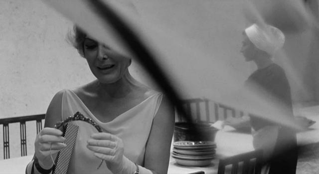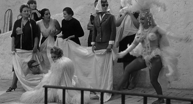 换句话说,诸如“不连贯”“无主题”“反逻辑”等评判,恰好表明了费里尼对电影艺术的新的开拓。尤其是,现实与幻想(或梦境)的界限被彻底抹去了,电影叙事变得异常自由,穿插在“假作真时真亦假”的诗意流动中。比如圭多和妻子路易莎坐在咖啡座,路易莎看见情妇卡尔拉坐到另一个空位上,正处在愠怒的情绪中,一瞬间却突然转为迎上前去与卡尔拉寒暄恭维,甚至执手共舞——我们也就无需分清这究竟是圭多的幻想还是现实中路易莎采取了假意周旋的姿态。或者幻想段落被设置得极为明显,但蛮横无理地强行插进现实中。像是克劳迪娅驾车和圭多来到一处院落,一袭黑衣的克劳迪娅突然以白衣的幻想形象出现在明亮的窗户里牛来了,迈着轻盈步伐,手提油灯放到空地中央的小圆桌上。随后圆桌消失,院落恢复了空荡,克劳迪娅也回到了黑衣的现实形象——仿佛幻觉不需任何解释。