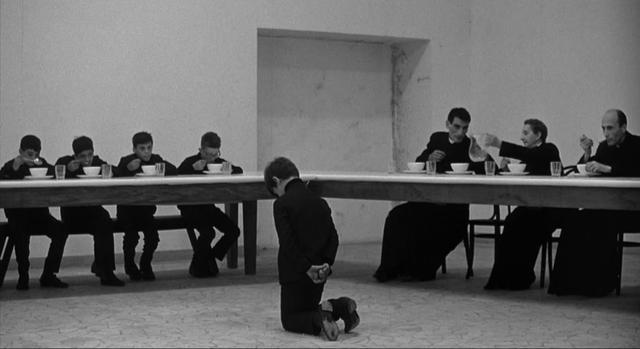 在一个更为夸张的镜头里,圭多低头跪在酒店楼梯下,以扮演奴才的方式迎接制片人的莅临,后者果然送给他一块高级手表。假如把这个场景与童年时受罚下跪的场景并置察看的话,荒谬性就更加鲜明了——过去是宗教体制,现在是商业体制,而卑微的主体总是受制于各类符号秩序的统摄。作为导演,圭多还受制于影评人道米埃尔的貌似权威的批评意见。道米埃尔指责他的“影片没有连贯性”、“主题不够突出”,缺乏“逻辑和清晰”,在在体现出电影观念的保守倾向,成为费里尼所追求的先锋探索精神的反面教材。也可以说费里尼用《八部半》这部影片直接挑战了以剧中人物道米埃尔为代表的陈腐的主流电影美学。