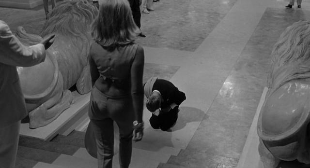 圭多的失败意味着费里尼的成功——破碎、紊乱、恍惚……这些美学特质反倒都从影片的叙事与视觉向度上充分体现出来。在后宫幻想那段的前半部分,镜头前不时有纱巾般的物体在飘忽晃动,使得画面充满了动感和虚幻,随后室内光影的上下起伏晃动也暗示了心理状态的骚动不安。